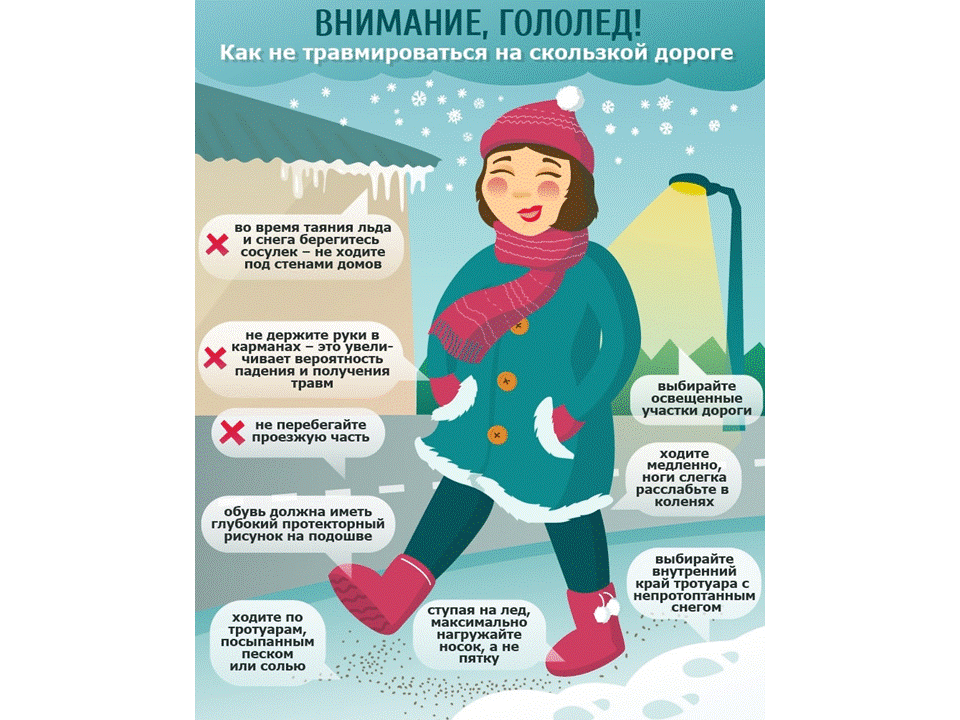 В связи с неустойчивостью погоды, способствующей образованию гололеда и в дальнейшем при ухудшении погодных условий в виде осадков снега и возросшей скользкости на дорогах, тротуарах, подъездных путях, повышается риск травматизма.